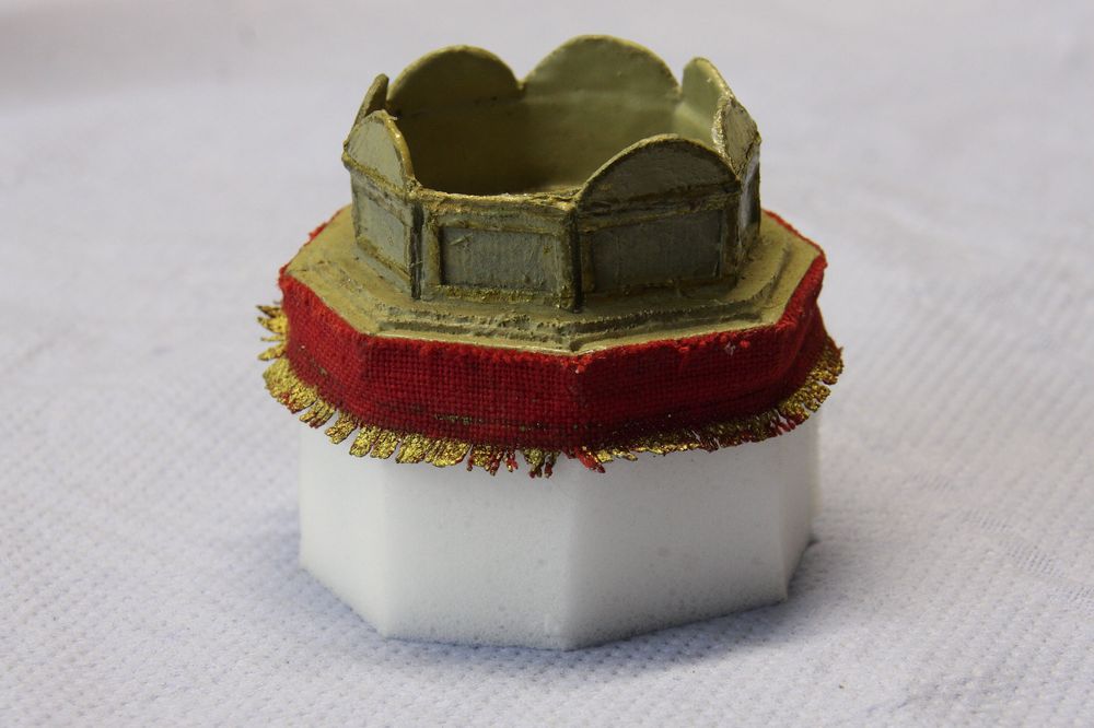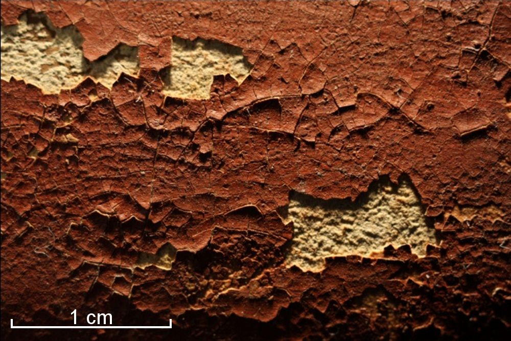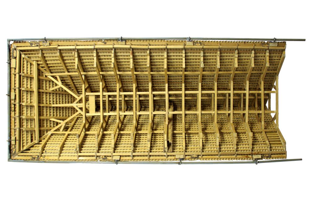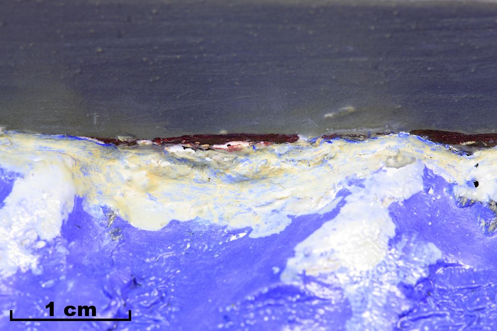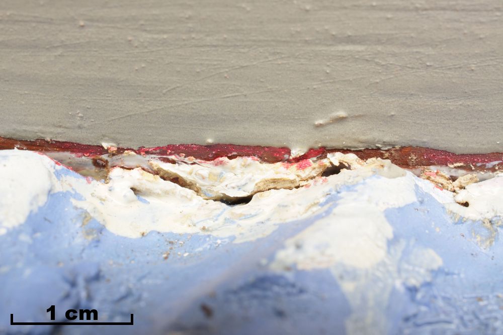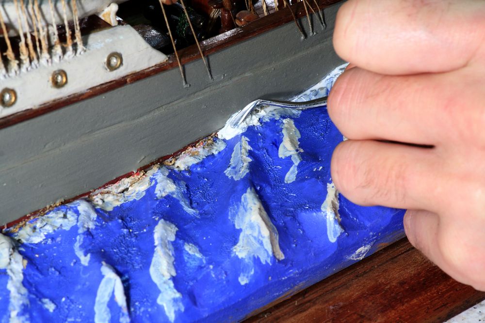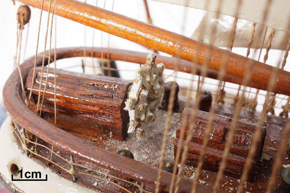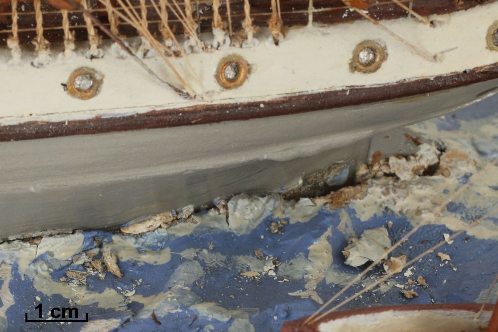 Das Vollschiff wurde vom Modellbauer in eine passende Aussparung in eine geschnitzte "Wasseroberfläche" gesetzt. Eventuelle Fugen wurden mit einer Mischung aus Kreiden und vermutlich Schelllack verkittet. Durch Klimaschwankungen und Alterung sind diese Kittungen aufgerissen. Ziel ist hier das Schließen der Risse ohne Verlust der Originalsubstanz.