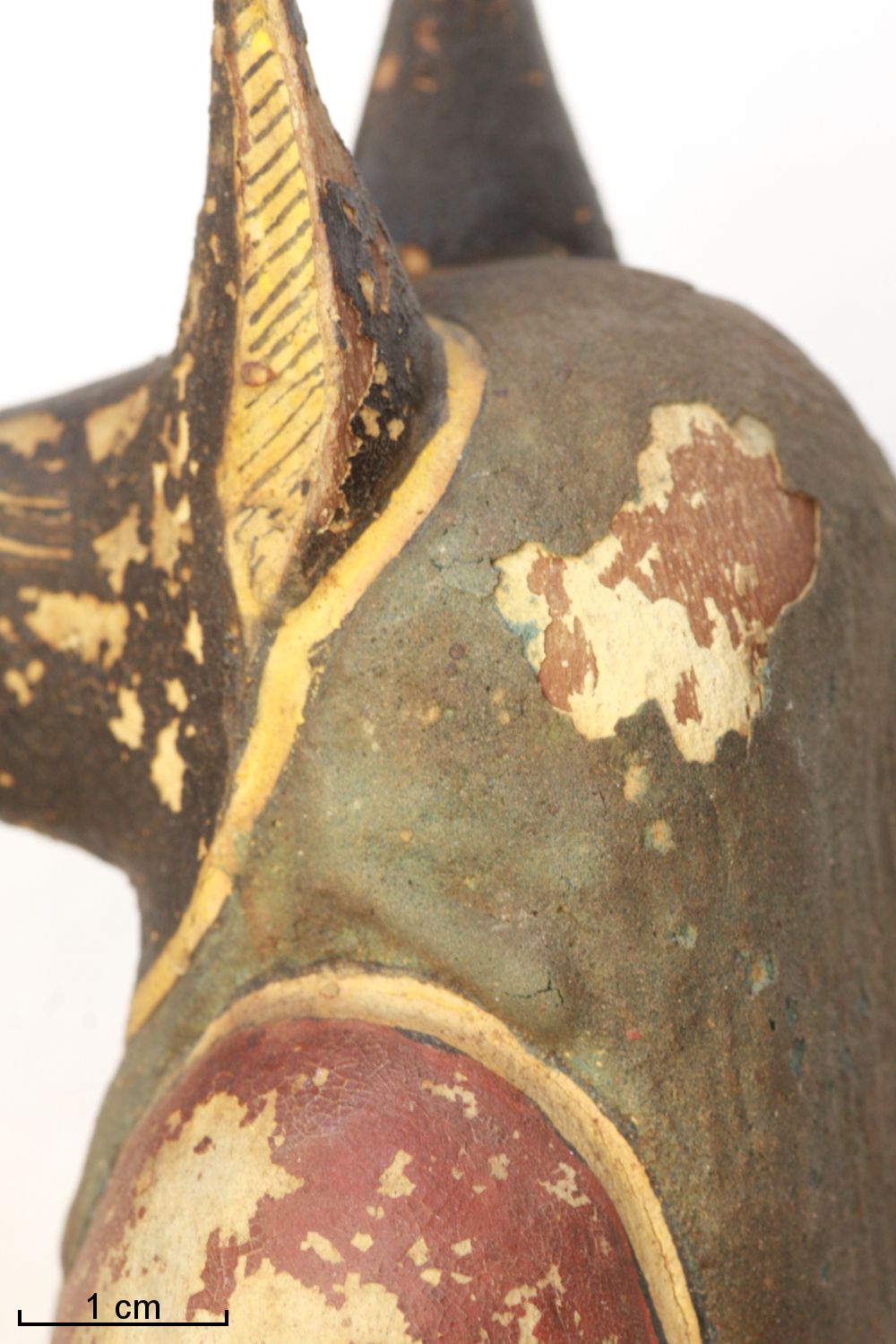 Neben leichten Verschmutzungen weist die Statuette eine sehr fragile Malschicht auf. Außerdem ist der Sockelbereich durch Termitenfraß geschädigt. Ziel der Restaurierung ist daher die Festigung der Malschicht und das Ergänzen des Sockels, sodass die Statuette ausgestellt werden kann. Für die Festigung der Malschicht ist die Analyse der Bestandteile und deren Löslichkeit besonders wichtig. Daher wurde die Malschicht eingehend untersucht und der Zustand dokumentiert.