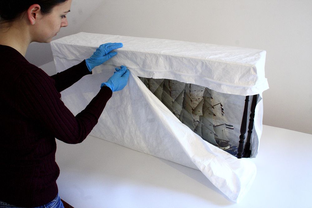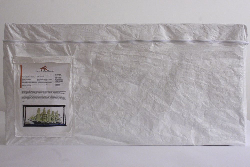 Da das Objekt nach der Restaurierung in einem Depot eingelagert werden soll, wurde eine passende Hülle aus Polyethylen-Vlies mit Reißverschluss angefertigt. Diese ist dampfdurchlässig, wasserabweisend und hält Staub fern. Eine Tasche für die Inventarkarte und Unterlagen zum Objekt erleichtert das Verwalten und Wiederfinden im Depot.