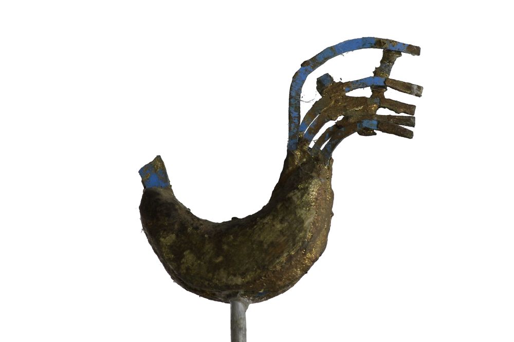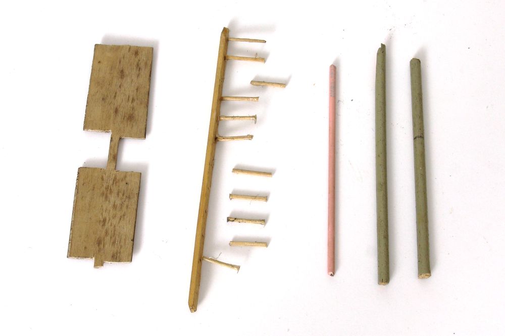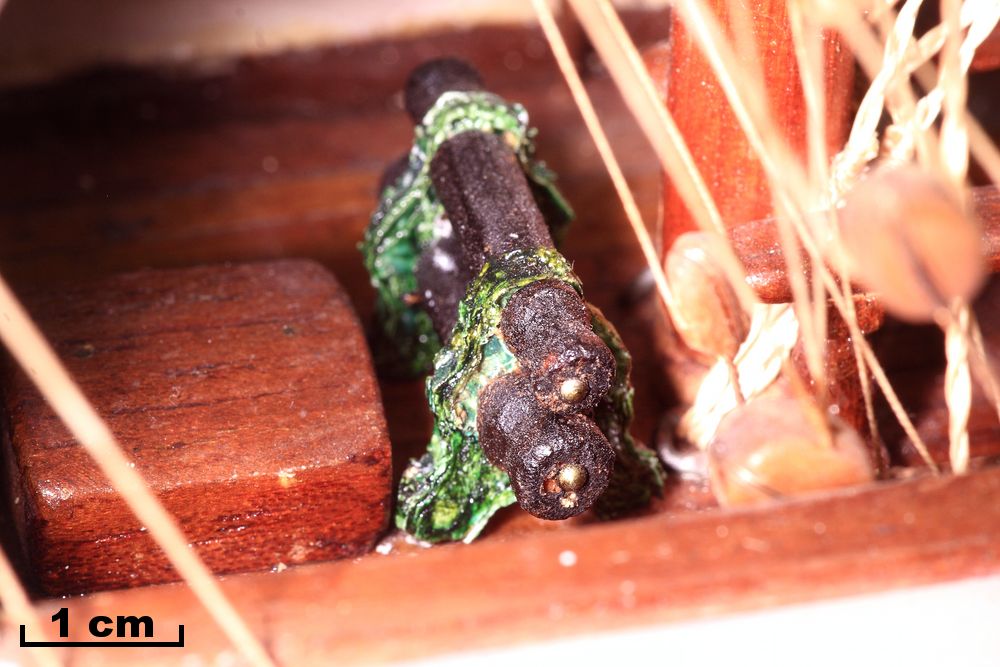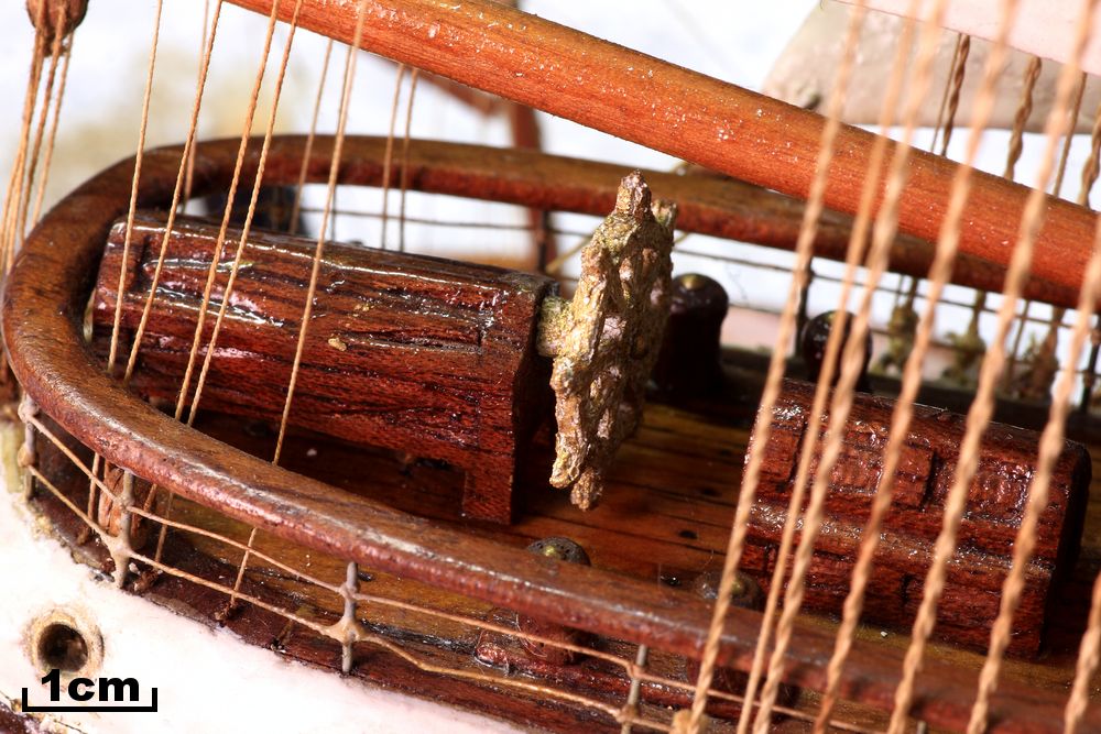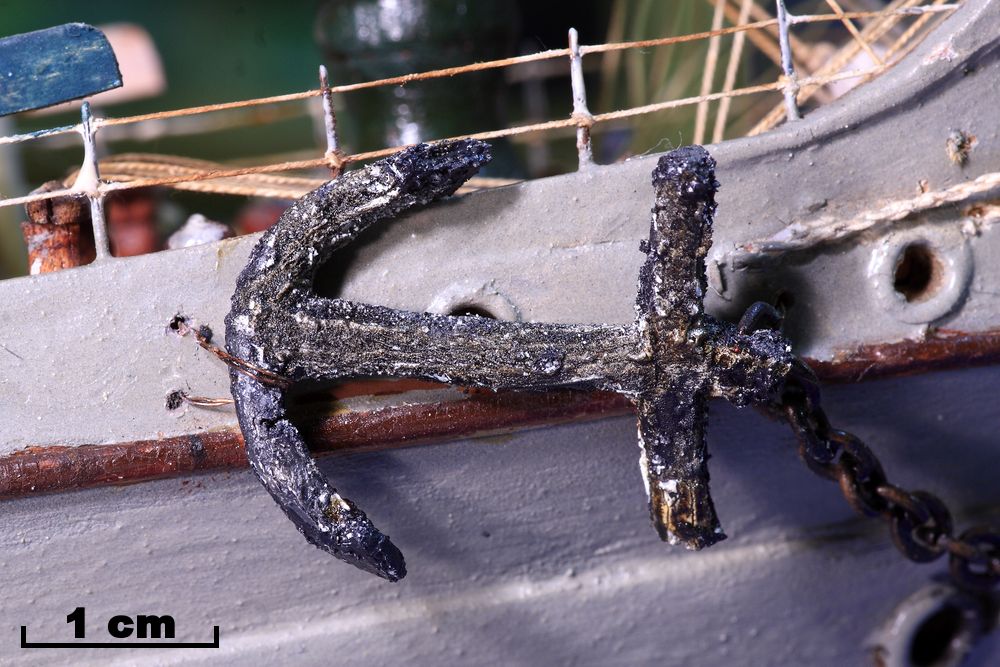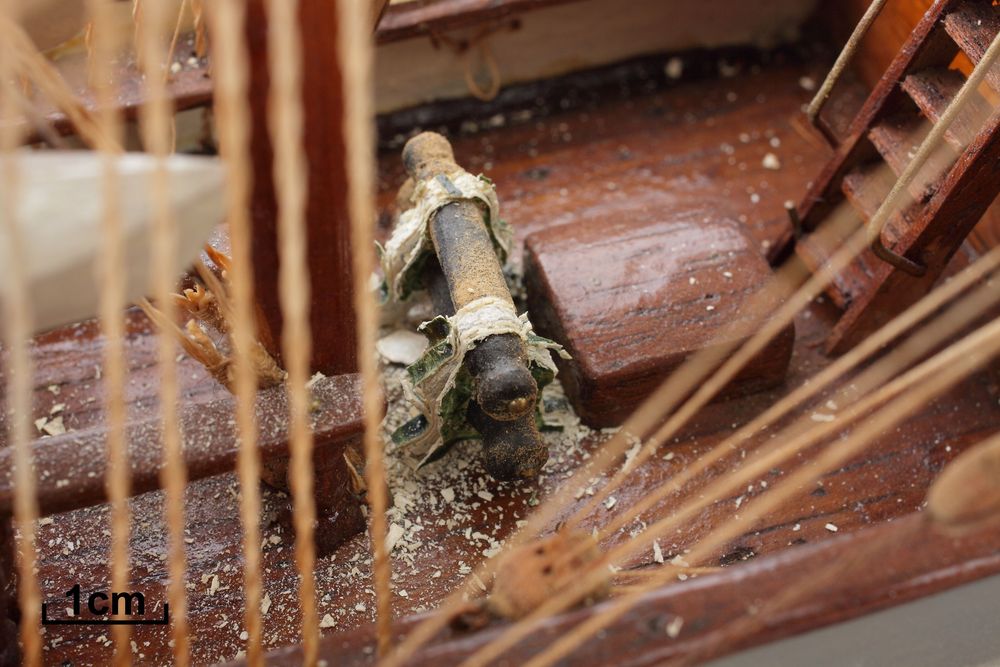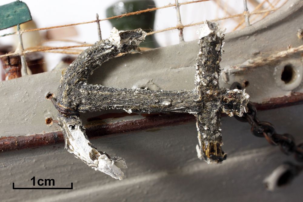 Anker, Steuerrad, eine Winsch und die Marsen an den Masten sind aus einer Blei-Zinn-Legierung gefertigt, die sich leicht mit einfachen Mitteln gießen lässt. Nachteilig ist, dass das darin enthaltene Blei stark korrodiert und eine weiße Kruste bildet (Blei-Acetat/"Bleiweiß"). Ziel der Restaurierung war es, diese zu reduzieren und einzudämmen, ohne dabei die darüber erhaltene Original-Farbfassung zu entfernen. Die Teile wurden daher mit einem Acryl-Harz gefestigt und anschließend retuschiert.