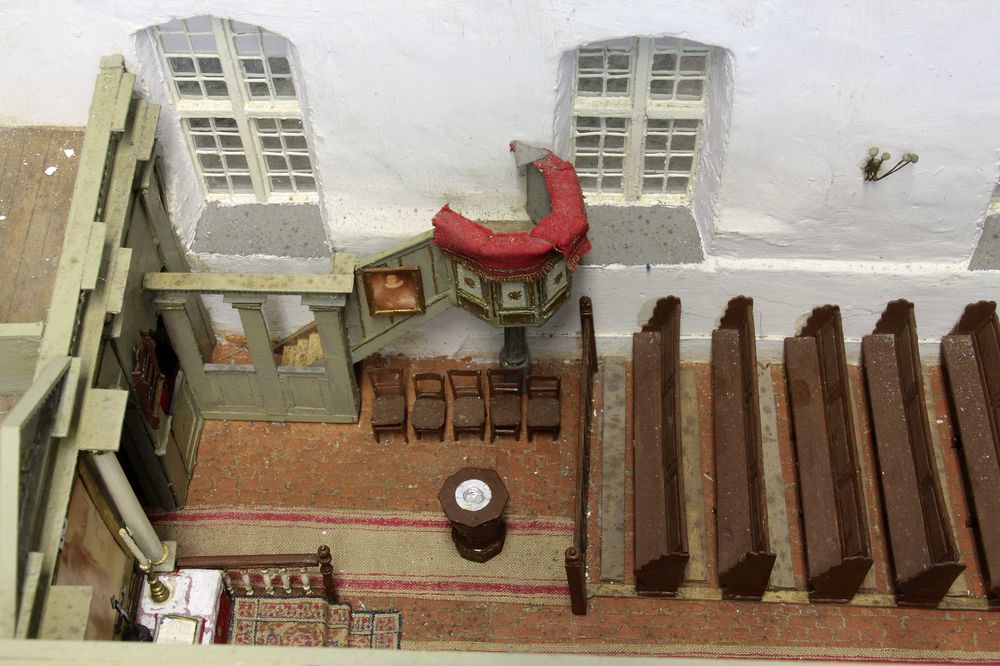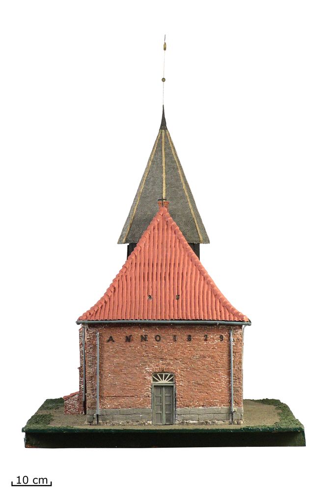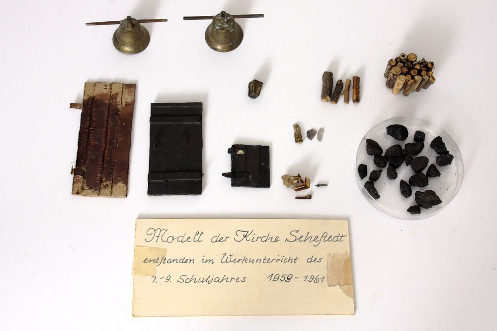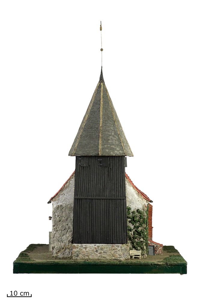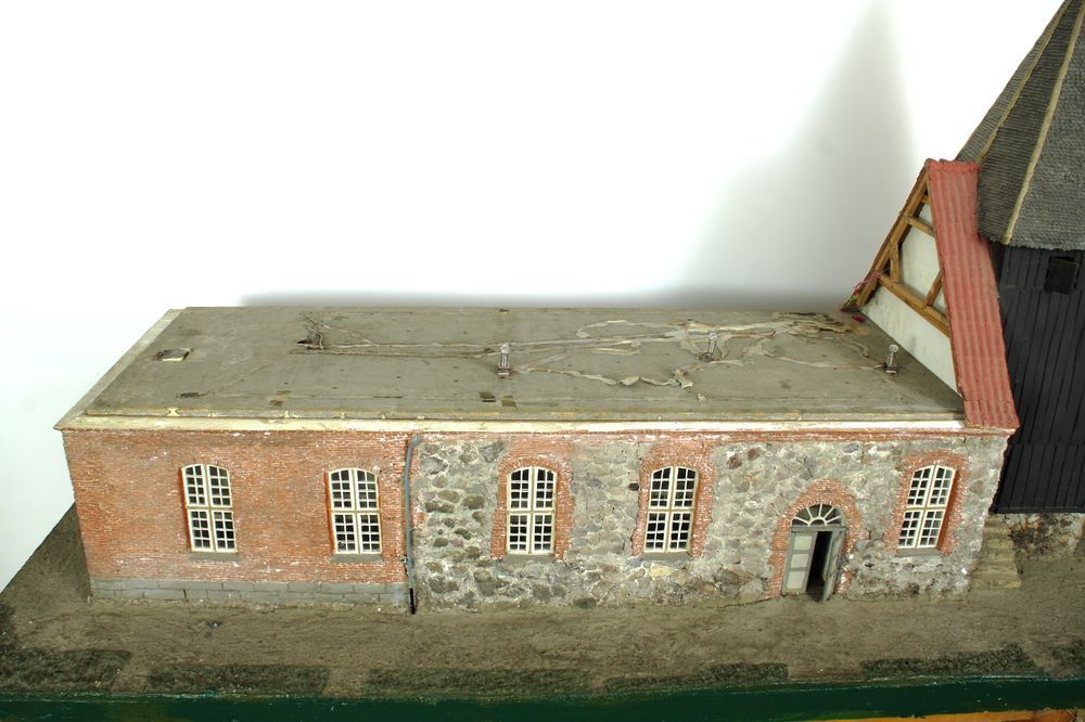 Das Modell der Dorfkirche wurde, wie der Globus, von den Schülern und Schülerinnen der 7.-9. Klasse unter Leitung des Lehrers Kaun in den Jahren 1959 - 1961 gefertigt. Hierbei wurden alle Materialien verwendet, die man bekam. Das Mauerwerk ist aus kleinen Kieseln und aus unzähligen, rot gestrichenen Holzstückchen aufgebaut. Der Dachstuhl und auch das Innere der Kirche wurden detailgetreu nachgestellt.