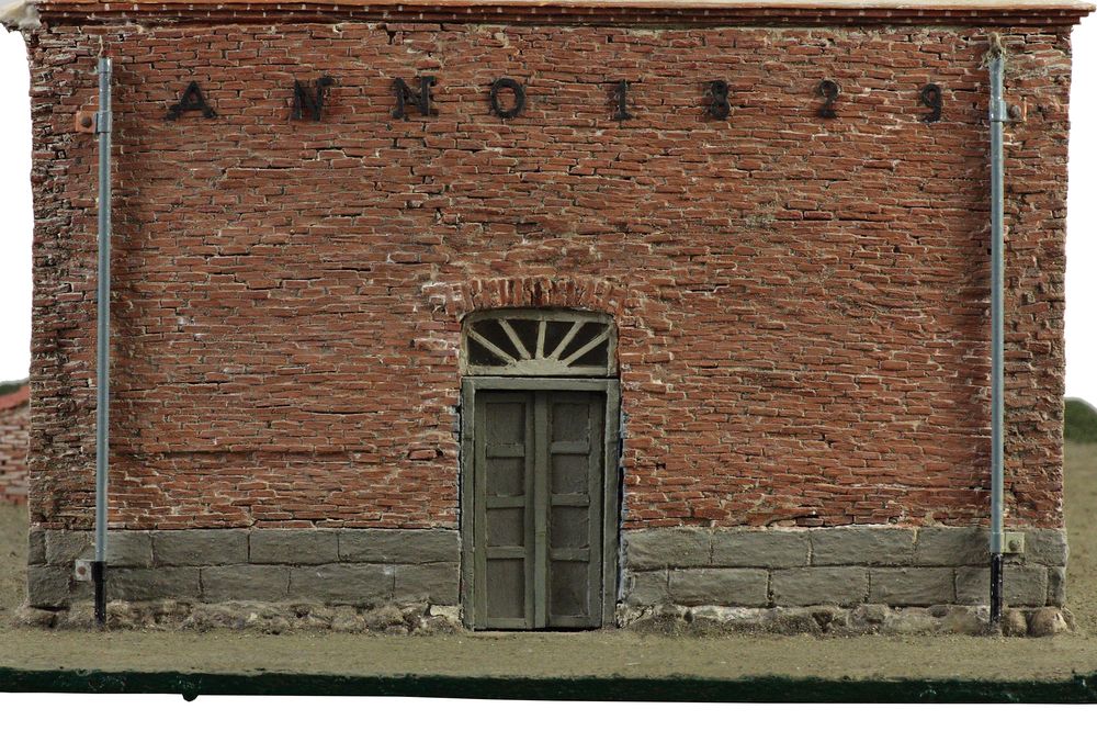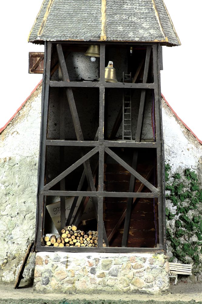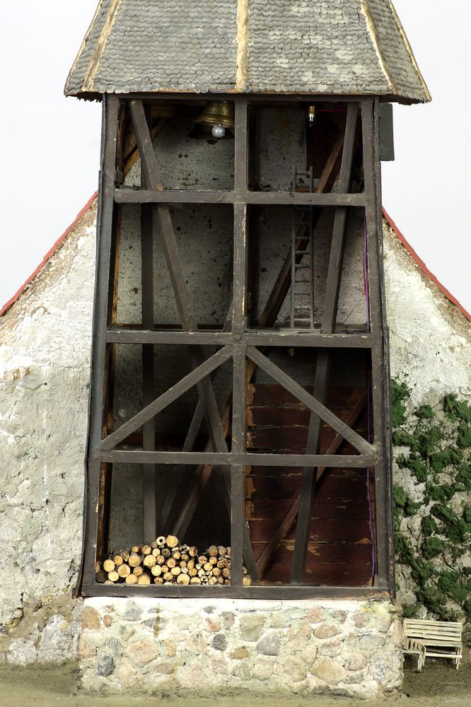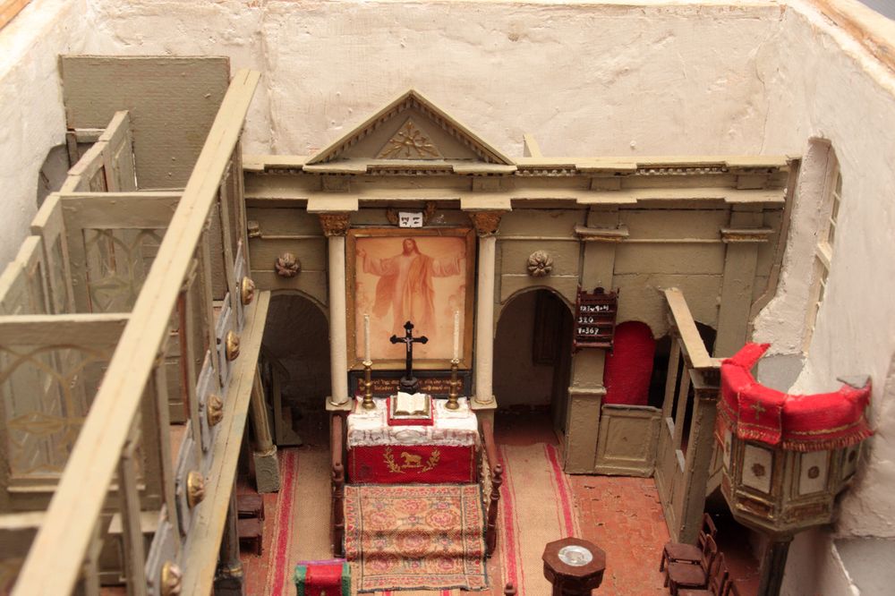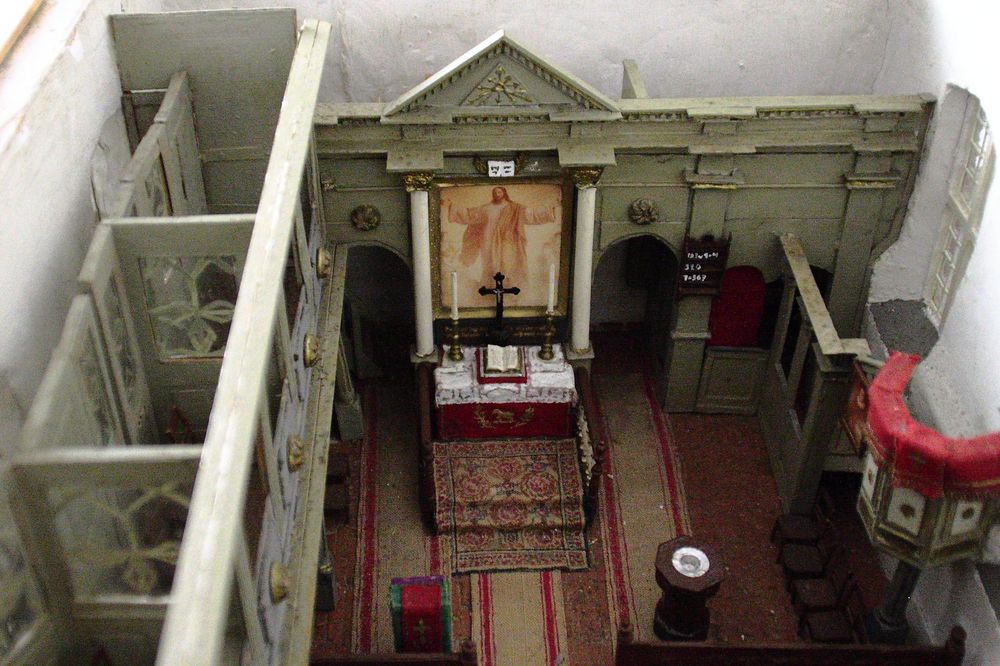 Das Modell der Dorfkirche wurde, wie der Globus, von den Schülern und Schülerinnen der 7.-9. Klasse unter Leitung des Lehrers Kaun in den Jahren 1959 - 1961 gefertigt. Hierbei wurden alle Materialien verwendet, die man bekam. Das Mauerwerk ist aus kleinen Kieseln und aus unzähligen, rot gestrichenen Holzstückchen aufgebaut. Der Dachstuhl und auch das Innere der Kirche wurden detailgetreu nachgestellt.