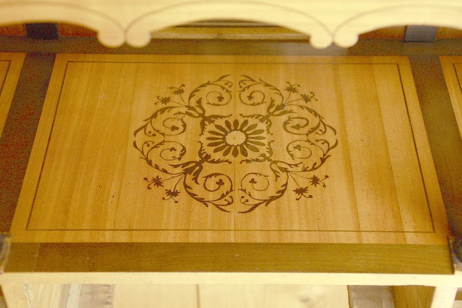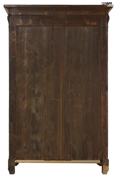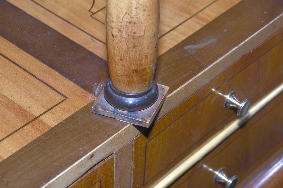 Das Objekt wurde gereinigt und lose Teile gefestigt. Die Risse in der Klappe und der linken Tür wurden verschlossen und retuschiert. Die Metallteile wurden gereinigt und mit mikrokristallinem Wachs versiegelt. Als Abschluss wurde der teils beschädigte Schellack regeneriert und aufpoliert. Normale Gebrauchsspuren wurden bewusst belassen.