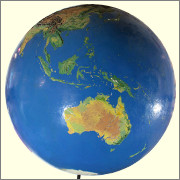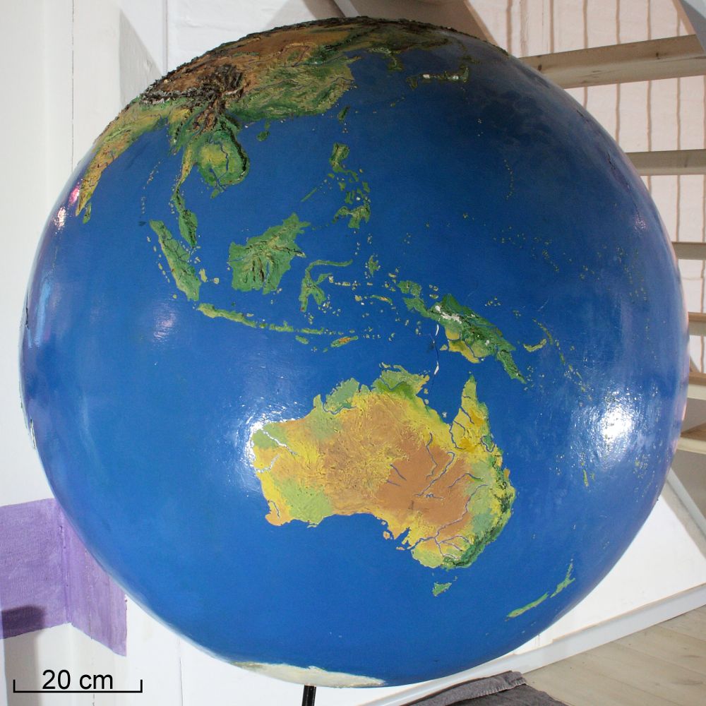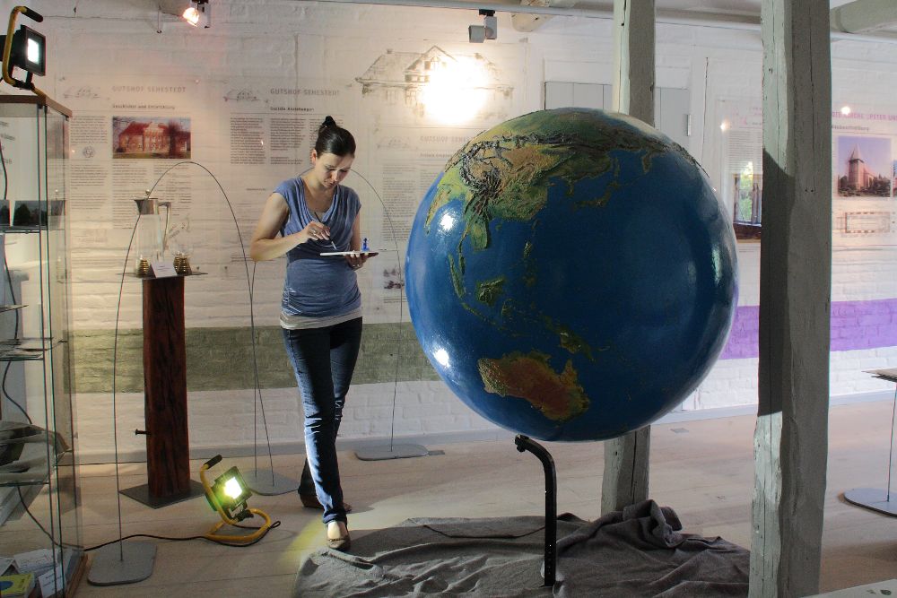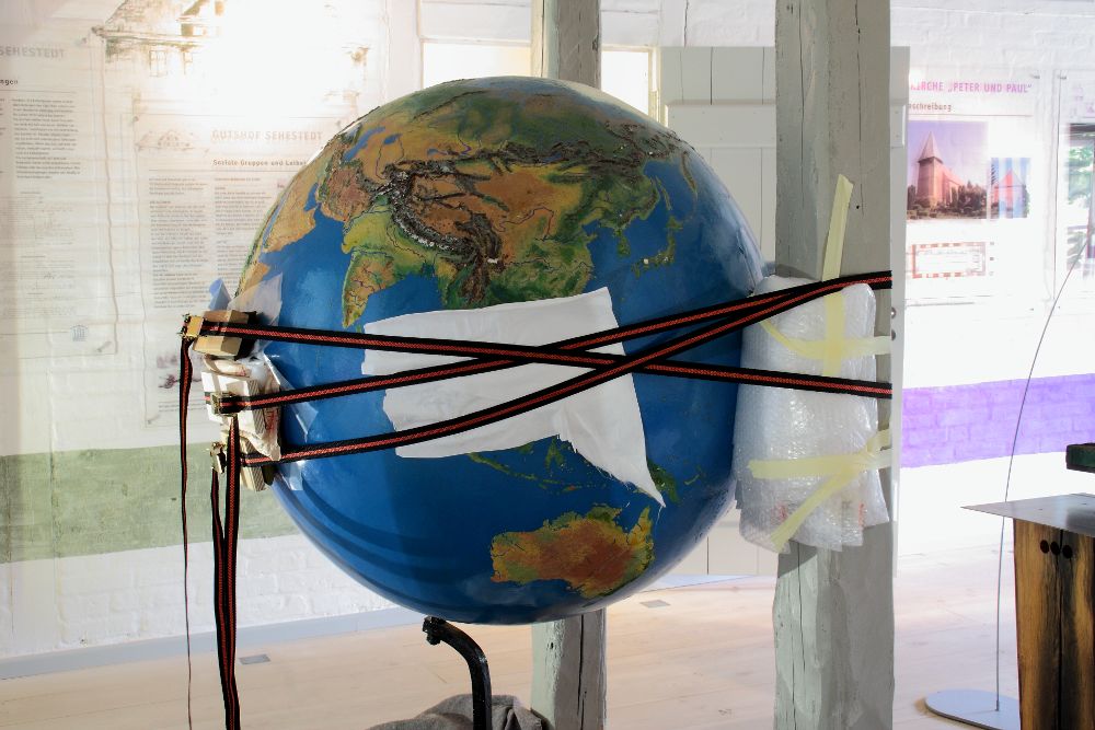 Der imposante Globus mit gut einem Meter Durchmesser wurde um 1968 von Schülerinnen und Schülern der 7.-9. Klasse unter der Leitung des Lehrers Kaun gefertigt. Auf einem schweren Fuss, geschmiedet vom Dorfschmied, ruht die Kugel aus einem filigranen Gerippe aus Holzleistchen, bespannt mit Segeltuch und modelliert mit einem Gemisch aus Weißleim, Kleister, Moltofill und Plastika. Die Schüler bekamen Planquadrate eines Atlanten zum Übertragen der Kontinente und Inseln zugewiesen. Diese wurden dann aufmodelliert und anschließend farbig ausgestaltet.