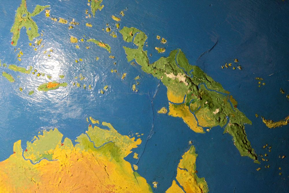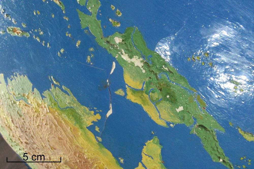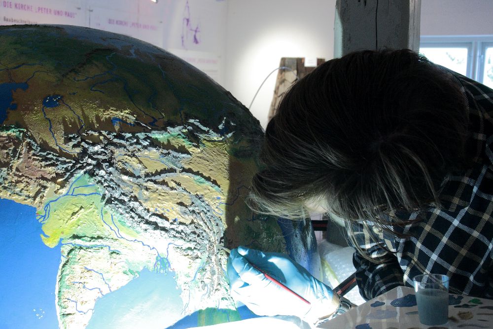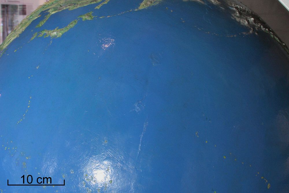 Nach der Verklebung, Kittung und Retusche aller Risse und der Reduzierung der Altretuschen ist der ursprüngliche Charakter des Globus wieder ungetrübt. Die hervorstehende Scholle konnte zwar nicht vollständig auf des ursprüngliche Niveau zurückgebracht werden, jedoch tritt diese nicht mehr so prägnant ins Auge.