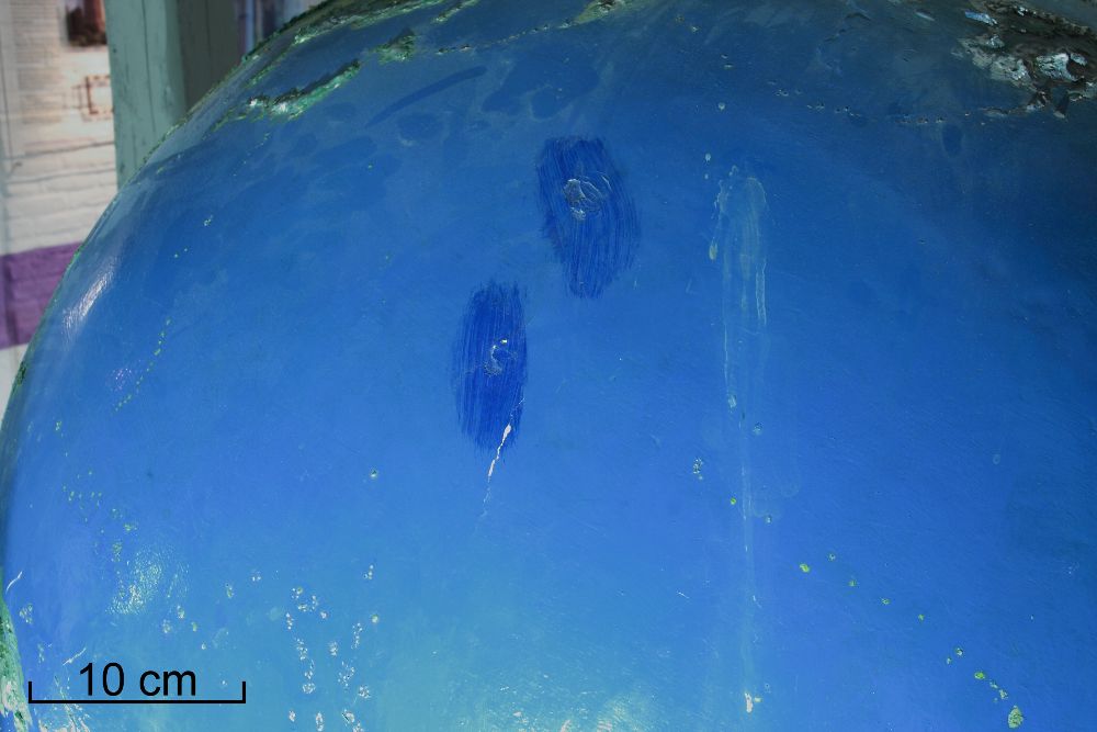Die Kugel selbst wurde nicht bearbeitet, da die daran befindlichen, kleineren Schäden nicht ohne erhebliches Risiko behoben hätten werden können.