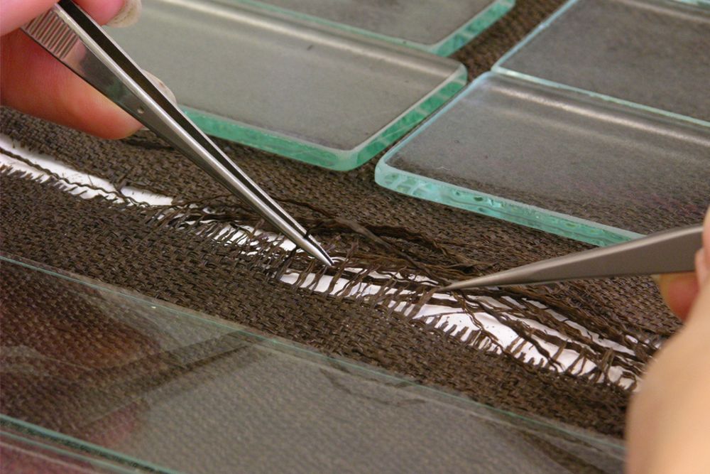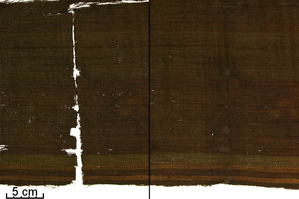 Für das Rückformen der Matte ist größte Vorsicht und teilweise das Befeuchten mittels Dampf notwendig. So dauerte der Prozess des Auffaltens an diesem Objekt mehrere Stunden. Anschließend konnten die Risse wieder neu verwebt und Fehlstellen mit gefärbtem Japanpapier hinterlegt werden.