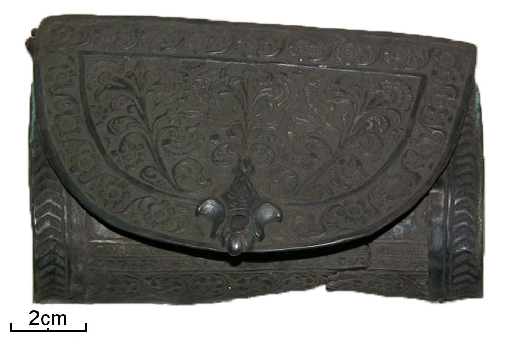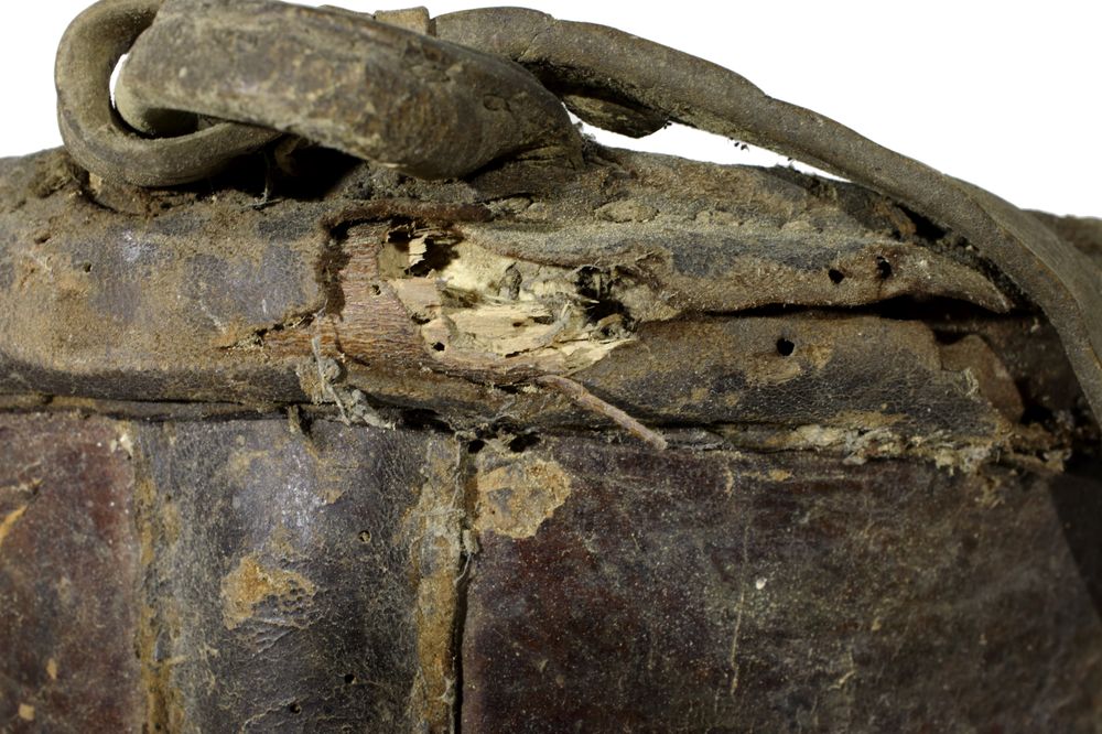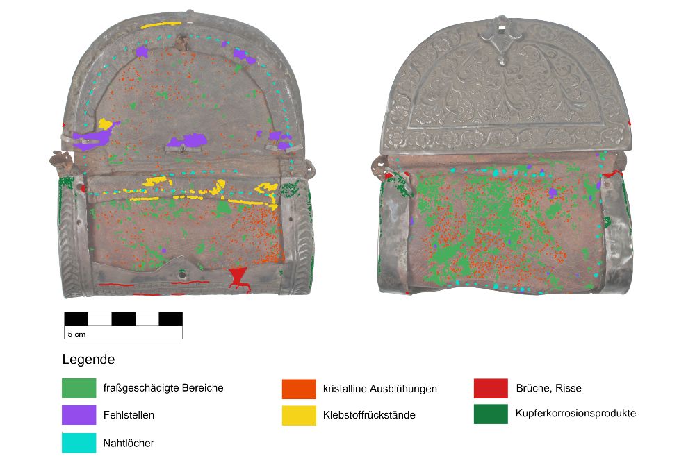 Für die Dokumentation der Tasche wurden Zeichnungen, Kartierungen und Fotografien angefertigt. Für die Restaurierung wurde die Tasche zerlegt. Hierfür mussten einige Metallklammern geöffnet werden. Nur so ließ sich die Tasche umfassend bearbeiten. Die Lederteile wurden zurückgeformt, die Metallteile gereinigt und eine physikalisch/chemische Trennung der Einzelteile beim Zusammensetzen eingefügt, sodass die gegenseitige Beeinflussung der Materialien minimiert werden konnte.