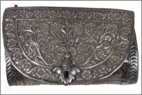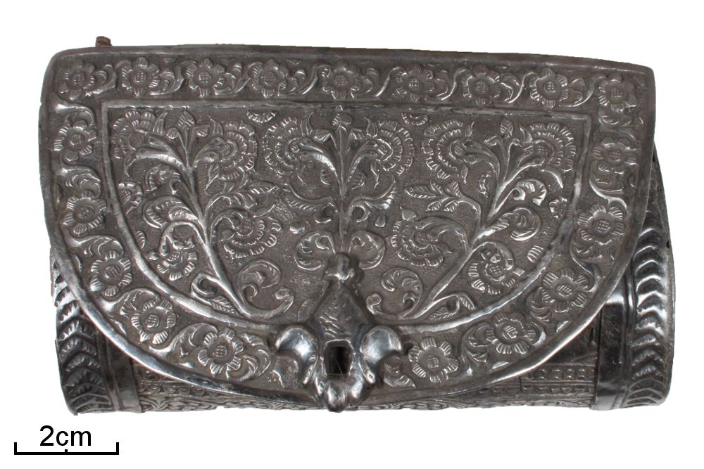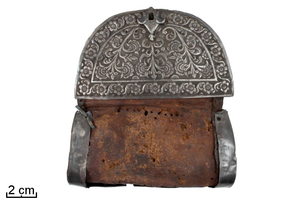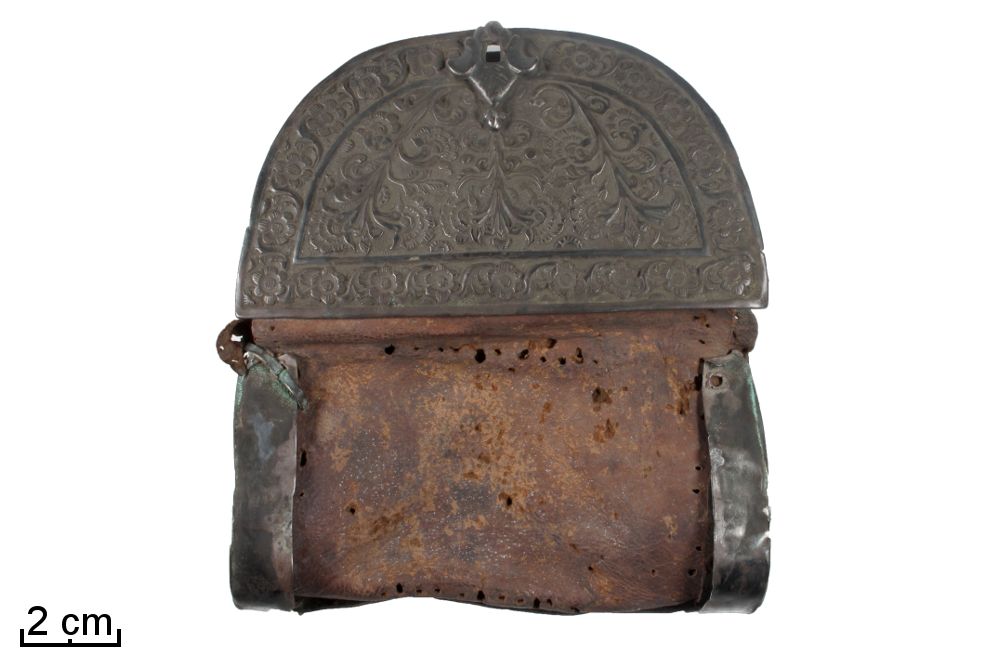 Die Kugeltasche aus Leder ist mit verziertem Silberblech beschlagen. Da die Inhaltsstoffe beider Materialien dem jeweils anderen Material schaden, stellt diese Materialkombination ein häufiges Problem dar. Ziel der Restaurierung ist daher zum Einen die Reinigung und Festigung, eine sachgemäße Verpackung und Lagerung des Objektes, aber auch die Dokumentation der Tasche und der daran feststellbaren Schäden.