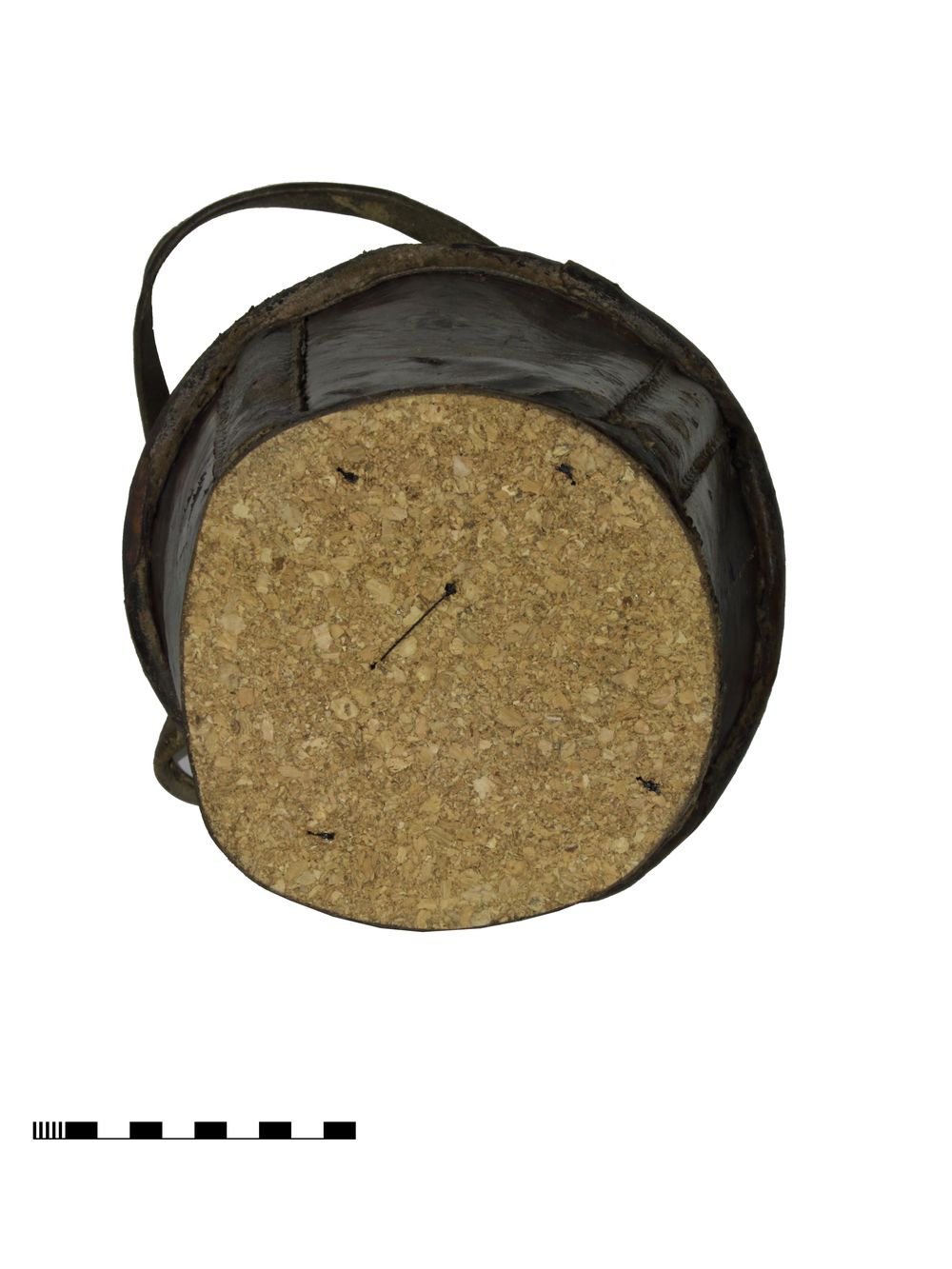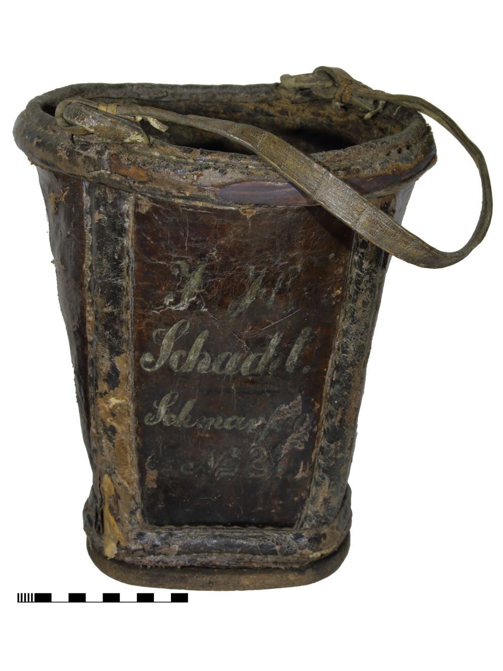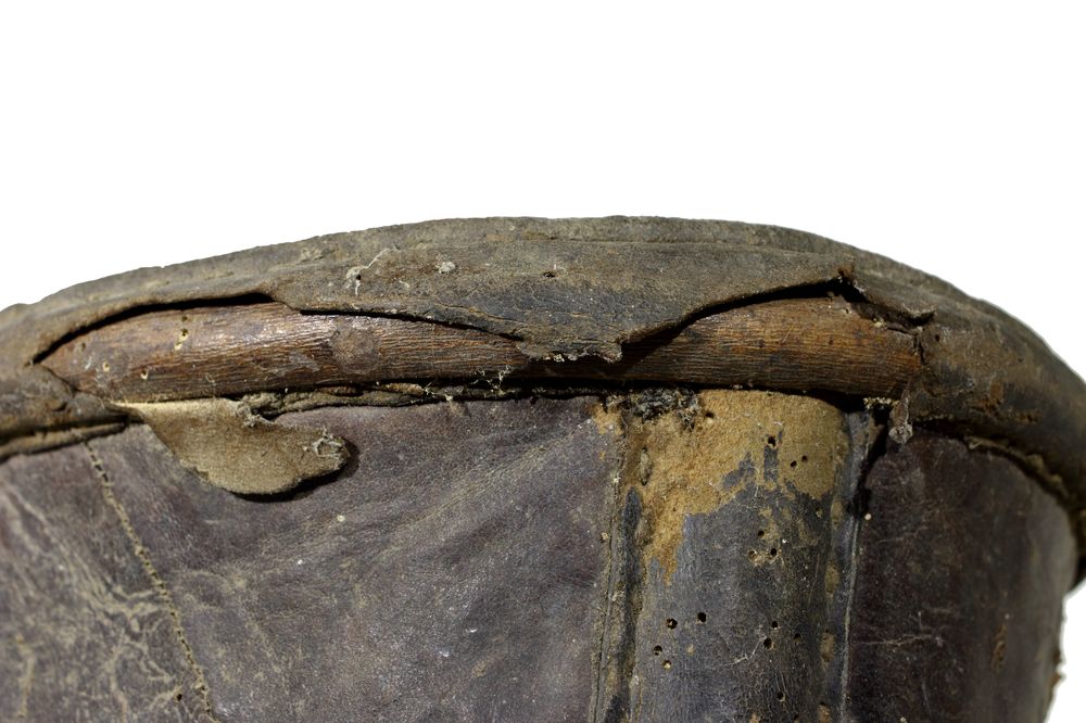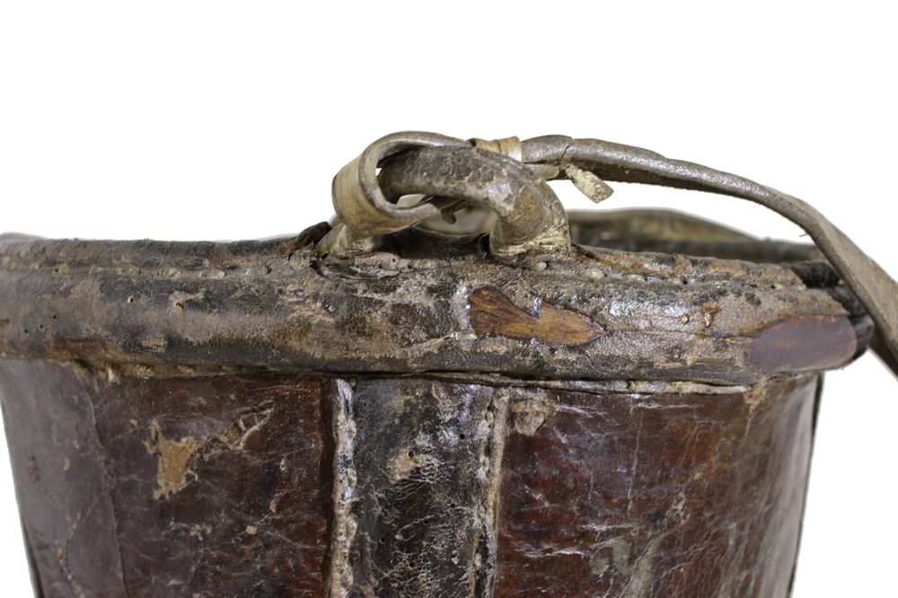 Für die Stabilisierung des Eimers wurde der fehlende Holzreif an der Oberkante des Eimers ergänzt und die einzelnen Lederlagen wieder fixiert. hierzu wurde ein alterungsbeständiger, elastischer und pH-neutraler Acrylklebstoff verwendet.