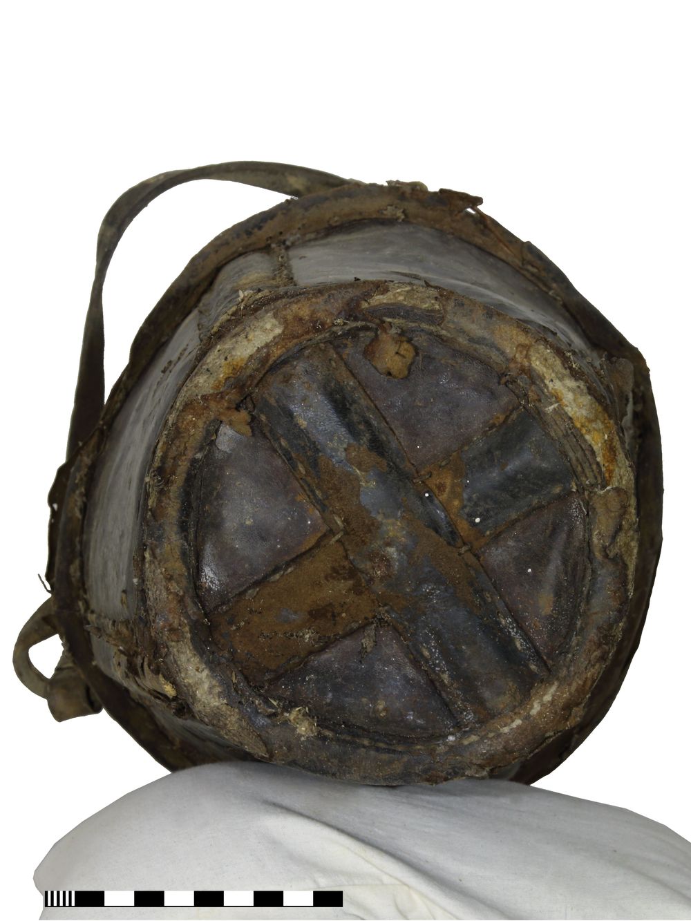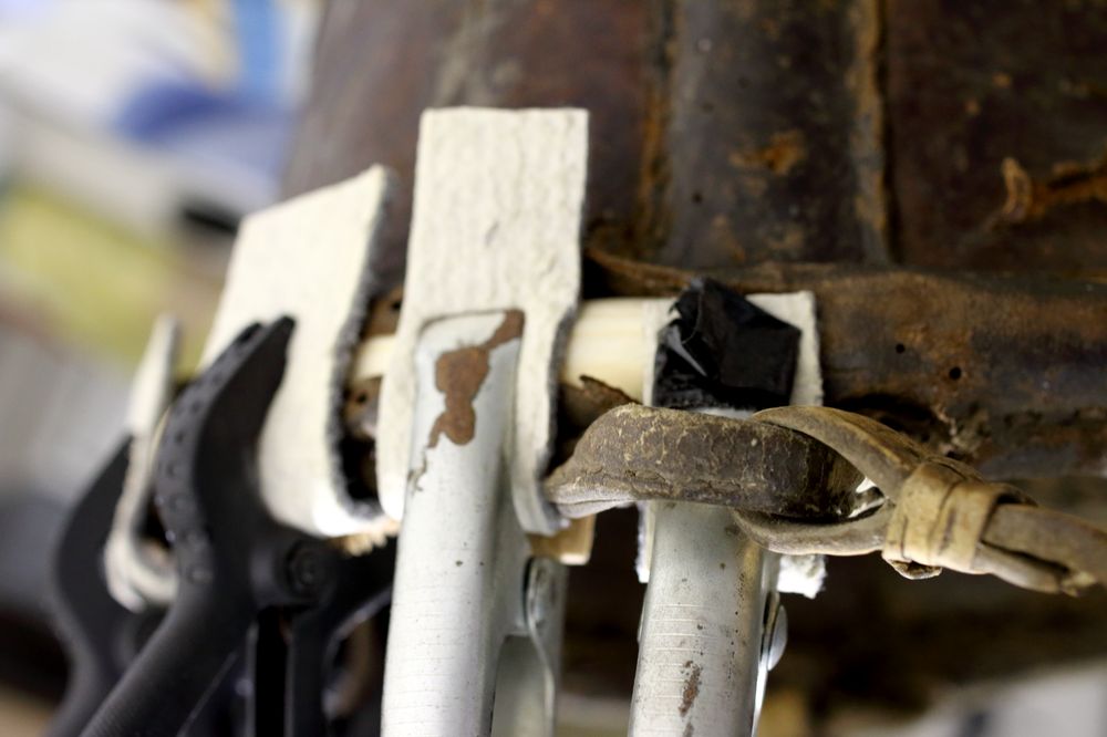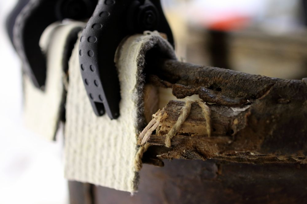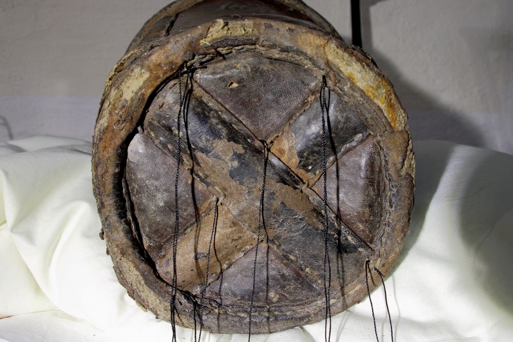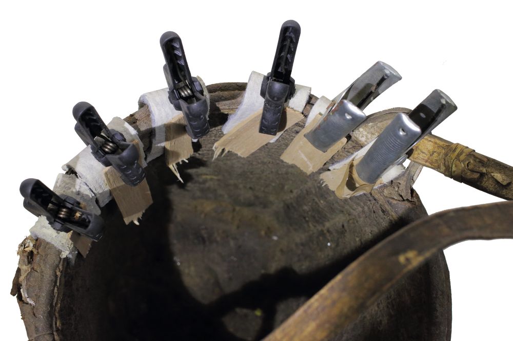 Für die Stabilisierung des Eimers wurde der fehlende Holzreif an der Oberkante des Eimers ergänzt und die einzelnen Lederlagen wieder fixiert. hierzu wurde ein alterungsbeständiger, elastischer und pH-neutraler Acrylklebstoff verwendet.