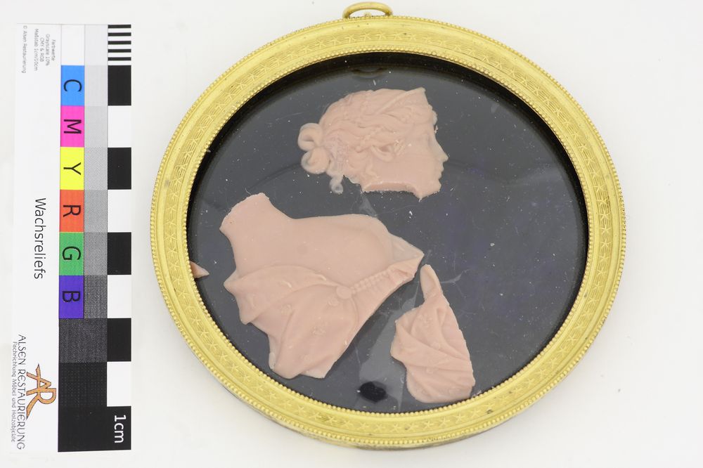 An diesen Stücken hatte das Relief der Königin Luise von Preußen einen Transportschaden erlitten und sich hierbei von der gläsernen Trägerplatte gelöst. Restauratorische Aufgabe war nun also die Fixierung der Teile auf der Trägerplatte, ein Fügen der Bruchkanten und eine Reinigung der Teile.