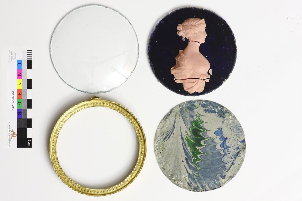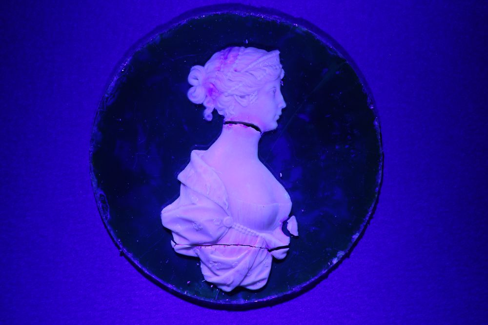 Die Medaillons wurden beide geöffnet und trocken, die Glasflächen auch mit Ethanol, gereinigt. Das Relief von Königin Luise wurde mit einem speziellen Acrylkleber auf die Trägerplatte geklebt. Kleinste Fehlstellen an den Bruchkanten wurden mit mikrokristallinem Wachs gekittet. Das Wachs wurde dazu mit Pigmenten passend eingefärbt.