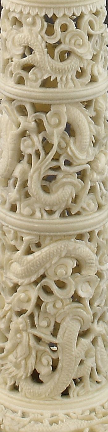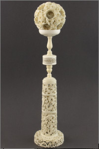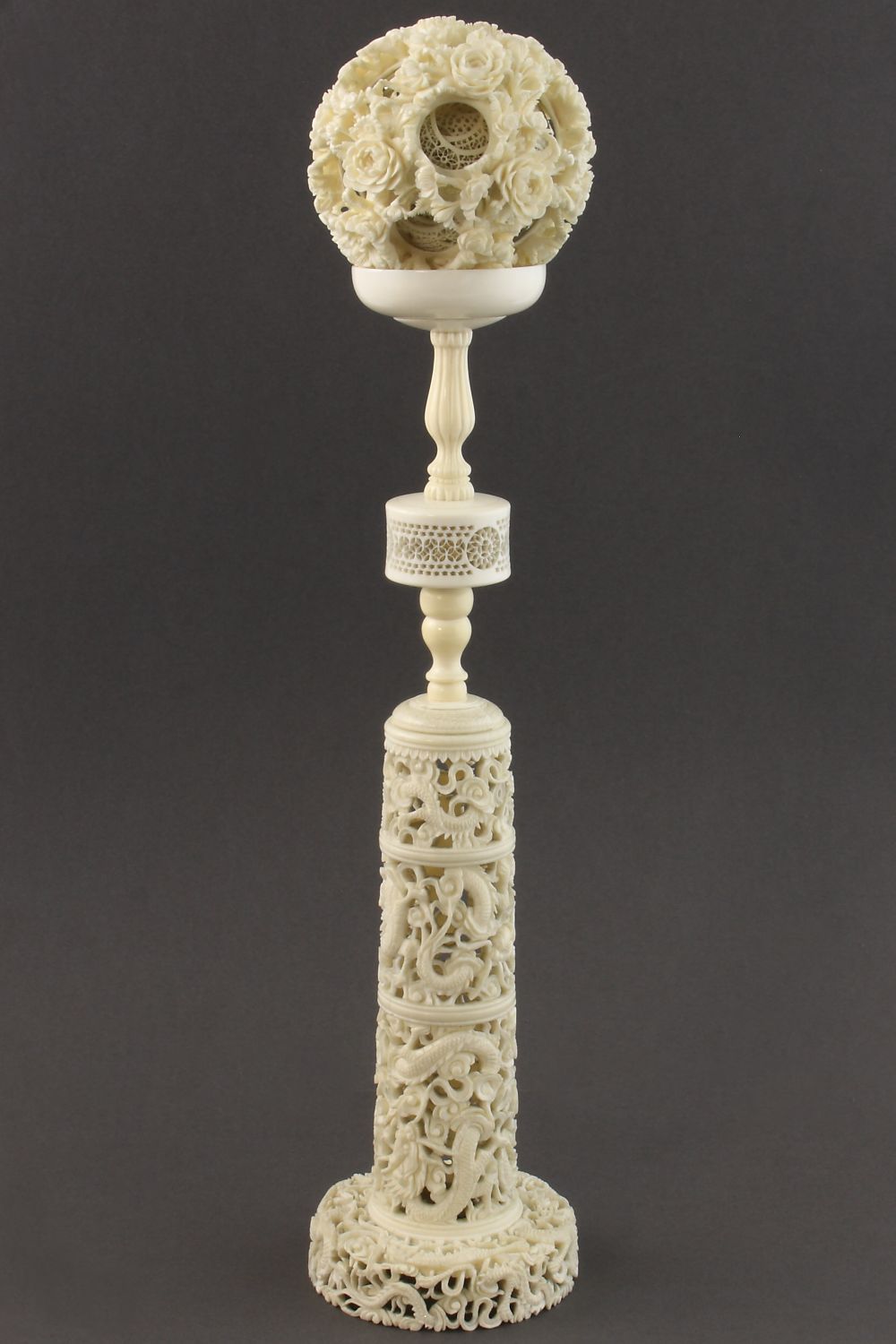 Diese Wunderkugel, auch bekannt unter Lebenskugel und etlichen anderen Begriffen, wurde aus Elfenbein gefertigt. Zunächst drechselte man mit speziellen Drechselwerkzeugen durch die größeren Löcher mehrere sehr feine Kugeln ineinander - Kugeln in den Kugeln. Anschließend wurden diese durch feine Schnitzereien und Durchbrechungen verziert. Häufig sind diese Kugeln auf einem einfacheren Ständer, ebenso geschnitzt aber meist kleiner und aus Holz gefertigt, zu finden.