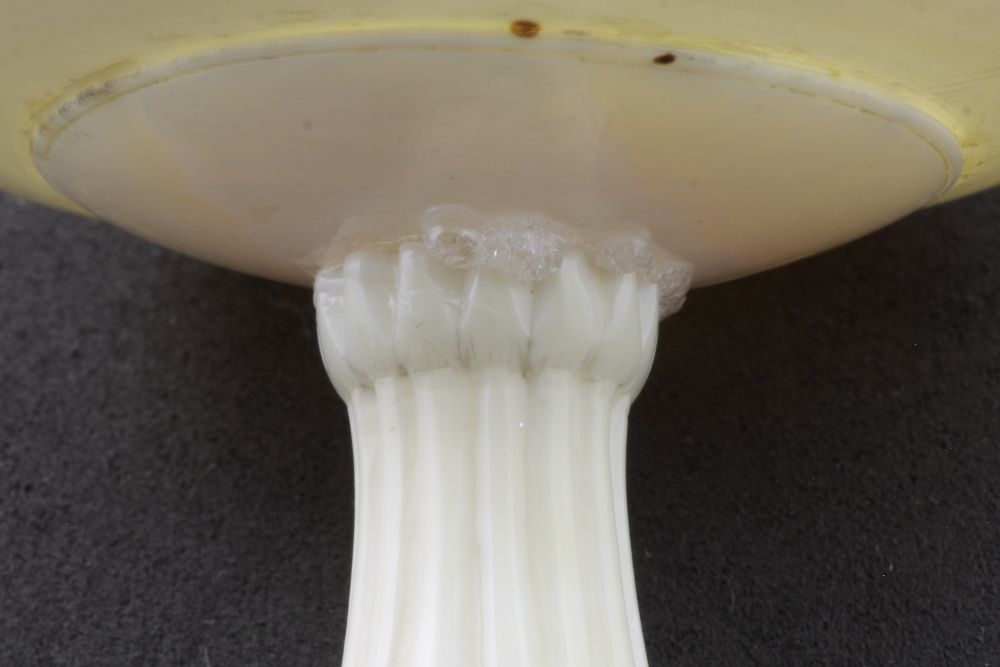 Dieses Exemplar ist auf einer feinen Stehle aus Elfenbein gelagert. Die einzelnen Elemente sind durch Gewinde, die filigran ins Elfenbein geschnitten wurden, verbunden. Durch Alterung und mechanische Belastungen sind diese Verbindungen beschädigt und wurden bereits mehrfach geklebt.